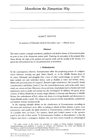 This text examines seemingly monotheistic, dualistic, and henotheistic features of Zoroastrianism from a Zoroastrian point of view, rather than the external lenses often applied. Exploring the personality of the principal deity, Ahura Mazda, the origin of the spiritual and material worlds as well as the veneration of the Yazatas, it is argued that Zoroastrianism has its own particular form of theism.
